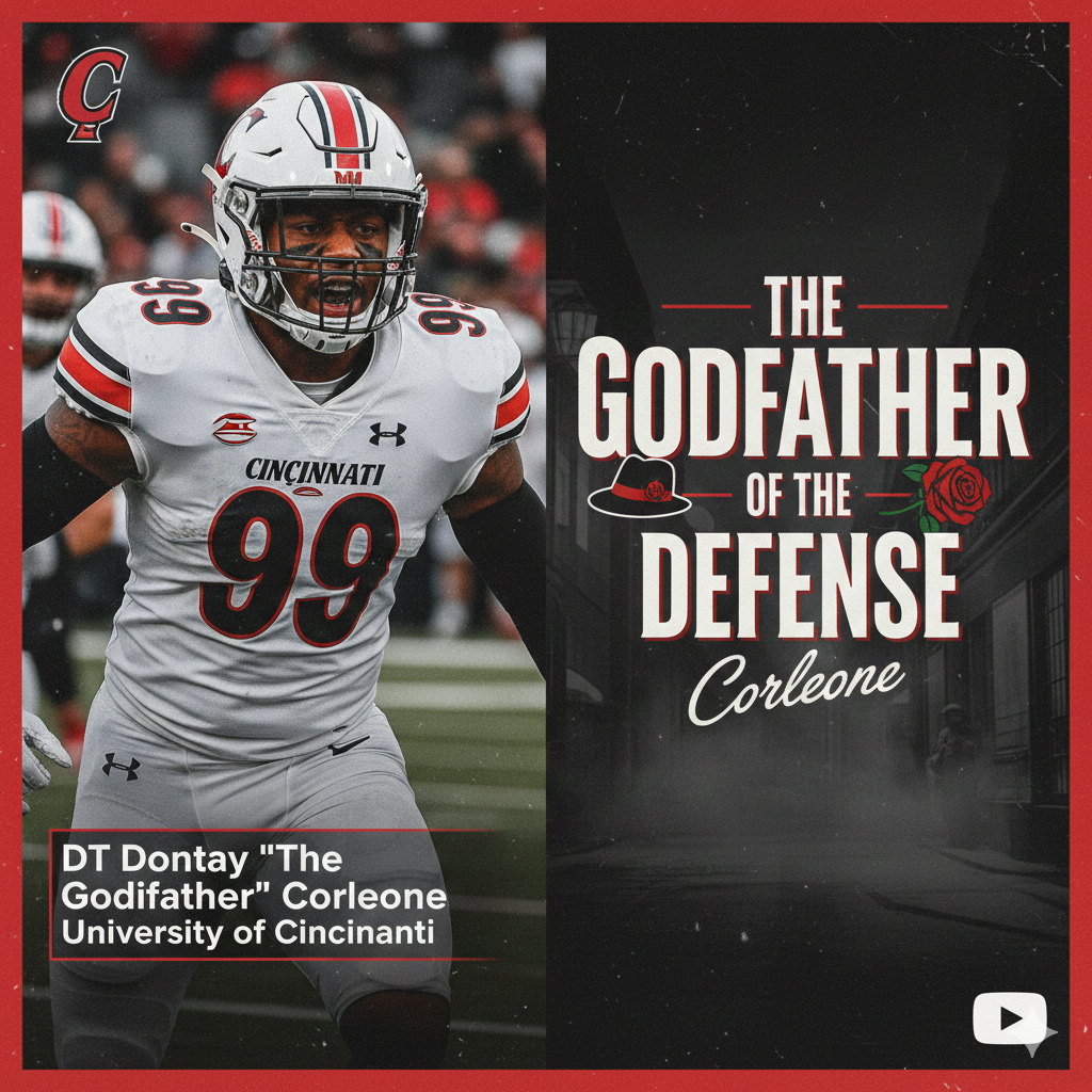 In an era where college defenses increasingly rely on hybrid fronts, twitchy interior rushers, and positionless chaos, Dontay Corleone is a throwback — a true nose tackle with the mass, leverage, and menace to take over a game from the A‑gaps. At 6’1” and 335 pounds, Corleone is built like a bank vault and plays like one too: immovable, unshakeable, and the foundation upon which Cincinnati’s defense has been constructed for the better part of four seasons. His nickname, “The Godfather,” isn’t just a clever play on his surname — it’s a reflection of his presence. When Corleone steps on the field, everything flows through him.