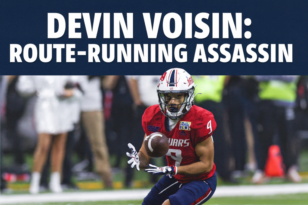 Devin Voisin enters the 2026 NFL Draft cycle as one of the most polished, reliable, and quietly dangerous receivers in the class—a technician with grown‑man nuance, a competitive edge, and a résumé built on production rather than projection. At South Alabama, he became the engine of the Jaguars’ passing game, stacking multiple seasons of high‑volume targets, chain‑moving consistency, and clutch playmaking. His profile isn’t built on measurables or viral highlights; it’s built on craft, toughness, and the kind of detail‑oriented receiver play that translates cleanly to Sundays.